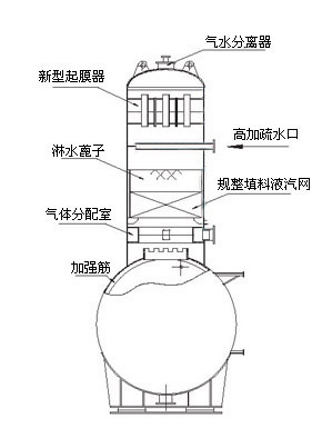 旋膜式除氧器的結(jié)構(gòu)型式主要由筒體外殼、汽水分離器、新型旋射起膜器、淋水篦子、規(guī)整波紋液汽網(wǎng)、水箱組成。